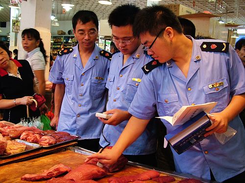 隨后,記者向食藥監(jiān)部門(mén)反映此事,當(dāng)日14時(shí)許,??谑协偵絽^(qū)中山食品藥品監(jiān)督管理所執(zhí)法人員趕到現(xiàn)場(chǎng)。執(zhí)法人員用手摸了摸攤位上的牛肉,并沒(méi)有立即做出判斷?!笆遣皇亲⑺H?,通常可以用手摸,看看黏不黏手,但這不能作為執(zhí)法的依據(jù)?!眻?zhí)法人員隨即聯(lián)系了瓊山區(qū)食品藥品監(jiān)督管理局有關(guān)負(fù)責(zé)人,詢問(wèn)是否可以用食品快檢車(chē)檢測(cè)注水肉,得到的答復(fù)是“暫時(shí)不可以”。該執(zhí)法人員稱(chēng),目前??谑乘幈O(jiān)部門(mén)正計(jì)劃引進(jìn)一種可以快速檢測(cè)注水肉的儀器CSY-R肉類(lèi)水分測(cè)定儀,待儀器配備到位后,他們將對(duì)培龍市場(chǎng)的所有鮮肉攤進(jìn)行檢測(cè),排除隱患。